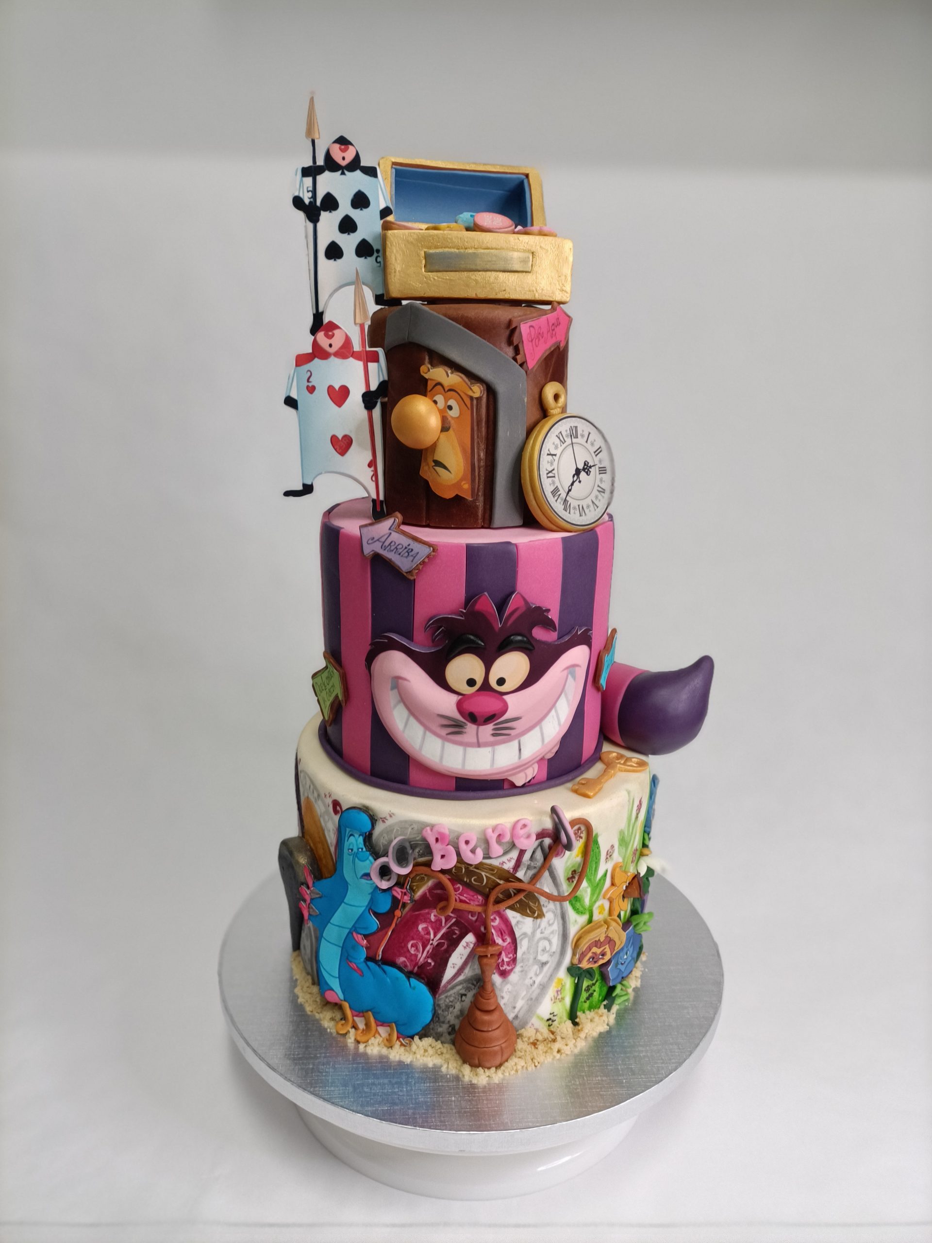 Colorida tarta decorada que se representa en dos dimensiones. Esto significa que todas las decoraciones y detalles del pastel se hacen en una superficie plana, como si se estuviera dibujando o pintando una imagen en la parte superior o en los laterales del pastel. Las tartas modeladas en 2D suelen utilizarse para crear imágenes detalladas y/o específicas, como personajes de dibujos animados, superhéroes, paisajes o cualquier otro diseño que se pueda imaginar. Utilizamos técnicas de profundidad y relieve sobre impresiones comestibles o fondant, colorantes alimentarios y otras herramientas de decoración para crear realismo en las imágenes.